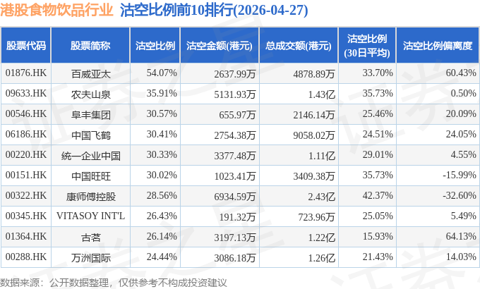 从沽空比例来看,百威亚太、农夫山泉、阜丰集团沽空比例位居行业前三,分别为54.07%、35.91%、30.57%。