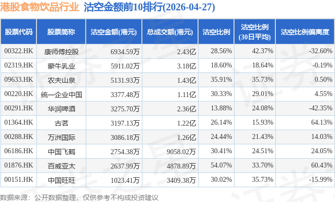 从沽空金额来看,康师傅控股、蒙牛乳业、农夫山泉沽空金额位居行业前三,分别为6934.59万港元、5911.02万港元、5131.93万港元。
