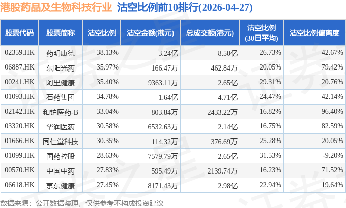 从沽空比例偏离度来看,亿腾嘉和、同源康医药-B、药师帮沽空比例偏离度位居行业前三,分别为294.92%、190.34%、139.84%。