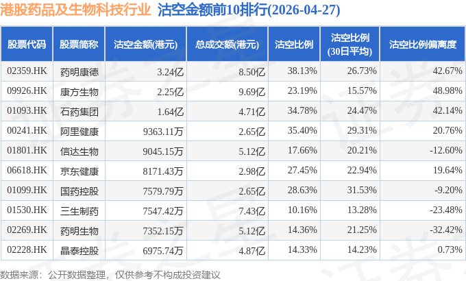 从沽空金额来看,药明康德、康方生物、石药集团沽空金额位居行业前三,分别为3.24亿港元、2.25亿港元、1.64亿港元。