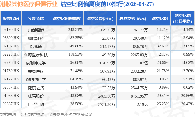 从沽空比例偏离度来看,归创通桥、现代牙科、医脉通沽空比例偏离度位居行业前三,分别为243.51%、182.35%、149.8%。