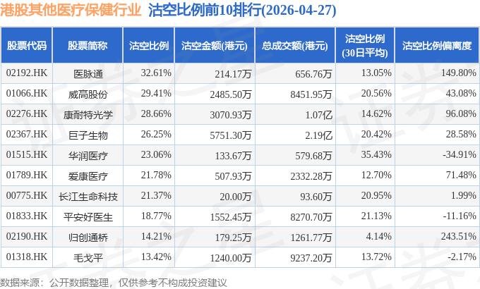证券之星消息,4月27日港交所披露数据显示,当日港股其他医疗保健行业的125只个股中有36只被沽空,总沽空股数为1858.39万股,总沽空金额为1.91亿元(港元),而当日其他医疗保健行业的总成交金额为16.98亿元(港元),沽空比例为11.25%。当日其他医疗保健行业总体跌0.13%。
