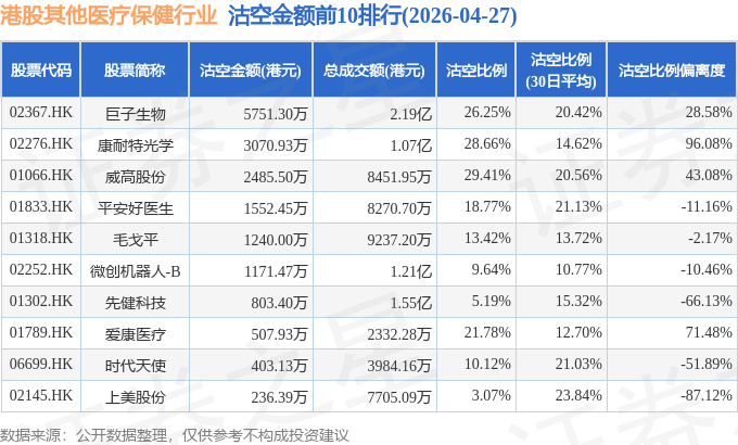 从沽空金额来看,巨子生物、康耐特光学、威高股份沽空金额位居行业前三,分别为5751.3万港元、3070.93万港元、2485.5万港元。