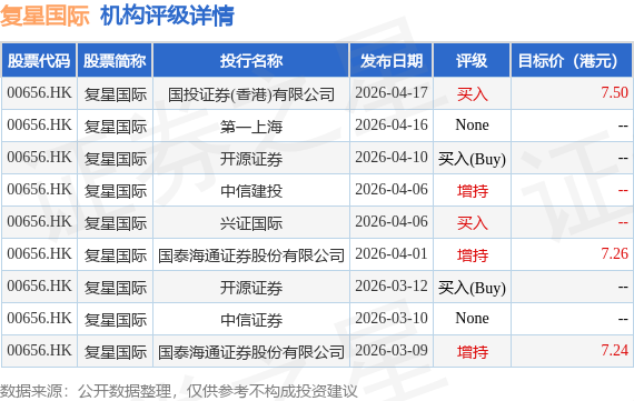 截至2026年4月27日收盘,复星国际(00656.HK)报收于4.02港元,上涨0.25%,成交量800.28万股,成交额3204.84万港元。投行对该股的评级以增持为主,近90天内共有3家投行给出增持评级,近90天的目标均价为7.33港元。国投证券(香港)有限公司最新一份研报给予复星国际买入评级,目标价7.5港元。
