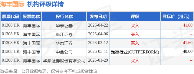 截至2026年4月27日收盘,海丰国际(01308.HK)报收于31.4港元,下跌1.13%,成交量502.25万股,成交额1.58亿港元。投行对该股的评级以买入为主,近90天内共有4家投行给出买入评级,近90天的目标均价为41.07港元。华泰证券最新一份研报给予海丰国际买入评级,目标价41.6港元。