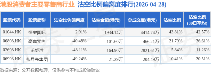 从沽空比例偏离度来看,恒安国际、高鑫零售、乐舒适沽空比例偏离度位居行业前三,分别为2.91%、-40.48%、-48.11%。
