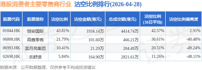 从沽空比例来看,恒安国际、高鑫零售、蓝月亮集团沽空比例位居行业前三,分别为43.81%、21.79%、10.41%。