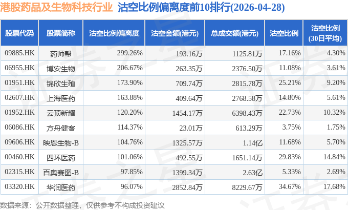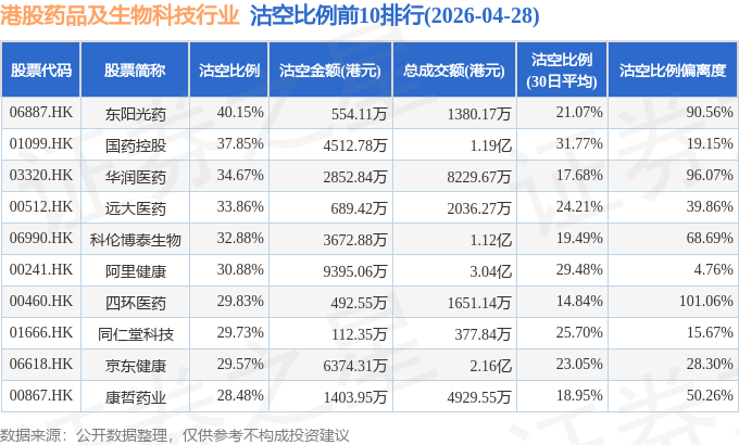 由于港股人民币柜台交易股票成交金额较小,沽空比例普遍偏高,为了避免干扰,已将人民币柜台交易股票从排行表格中剔除。