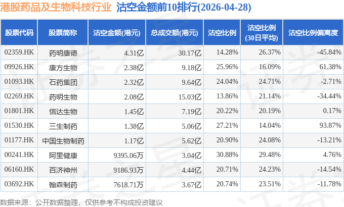 从沽空金额来看,药明康德、康方生物、石药集团沽空金额位居行业前三,分别为4.31亿港元、2.38亿港元、2.32亿港元。