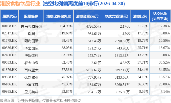 从沽空比例偏离度来看,青岛啤酒股份、锅圈、颐海国际沽空比例偏离度位居行业前三,分别为194.98%、119.6%、88.43%。