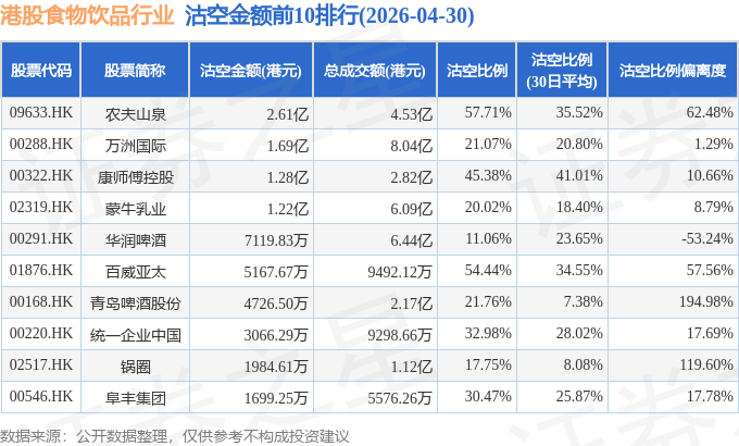 从沽空金额来看,农夫山泉、万洲国际、康师傅控股沽空金额位居行业前三,分别为2.61亿港元、1.69亿港元、1.28亿港元。