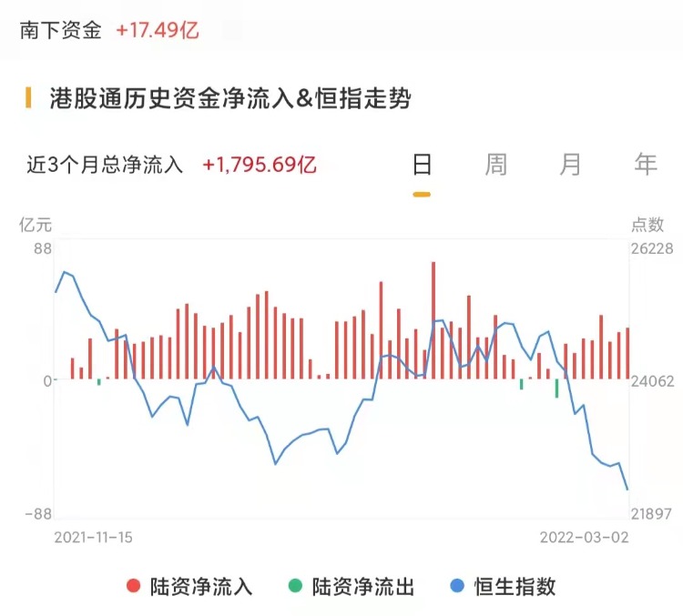 南下资金今日净流入港股17.49亿港元,上一交易日净流入31.82亿港元。