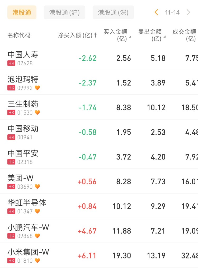 中国人寿、泡泡玛特、三生制药分别遭净卖出2.62亿港元、2.37亿港元、1.74亿港元。