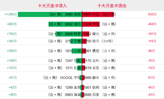 淡仓(认沽证及熊证)方面,近5日合计,美团、泡泡玛特及阿里巴巴等相关淡仓分别约1695万、883万及700万港元资金净流入部署;中芯国际、中国平安等相关淡仓则分别约833万、459万港元资金净流出。