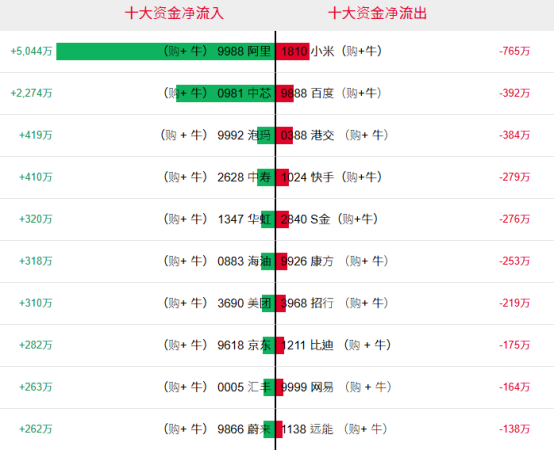 好仓(认购证及牛证)方面,过去5日,阿里巴巴相关好仓录得约5044万港元资金净流入,为最大资金流入标的,中芯国际、泡泡玛特及中国人寿等相关好仓也分别约2274万、419万以及410万港元资金净流入部署;小米、百度及港交所等相关好仓则分别约765万、392万及384万港元资金净流出套现。