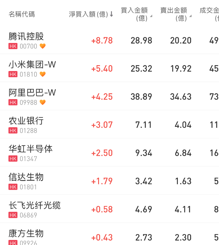 腾讯控股、小米集团-W、阿里巴巴-W分别获净买入8.78亿港元、5.4亿港元、4.25亿港元;