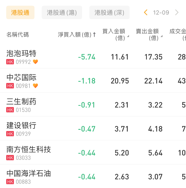 泡泡玛特、中芯国际、三生制药分别遭净卖出5.74亿港元、1.18亿港元、0.91亿港元。
