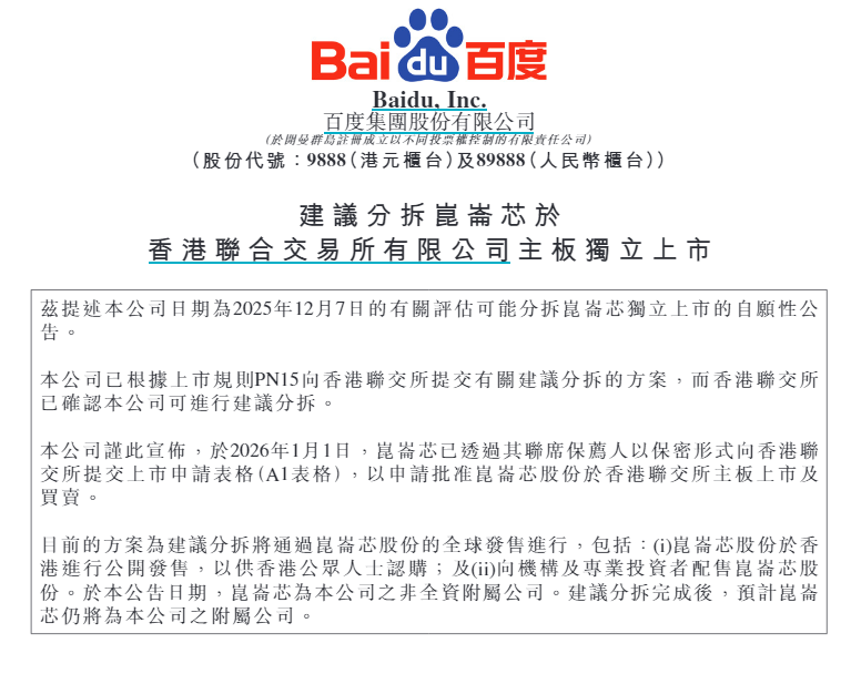 2025年12月,昆仑芯传出拟分拆并独立上市的消息。2025年12月7日,百度集团对此回应称,正就拟议分拆及上市进行评估。倘进行拟议分拆及上市,将须经相关监管审批程序,公司并不保证拟议分拆及上市将会进行。