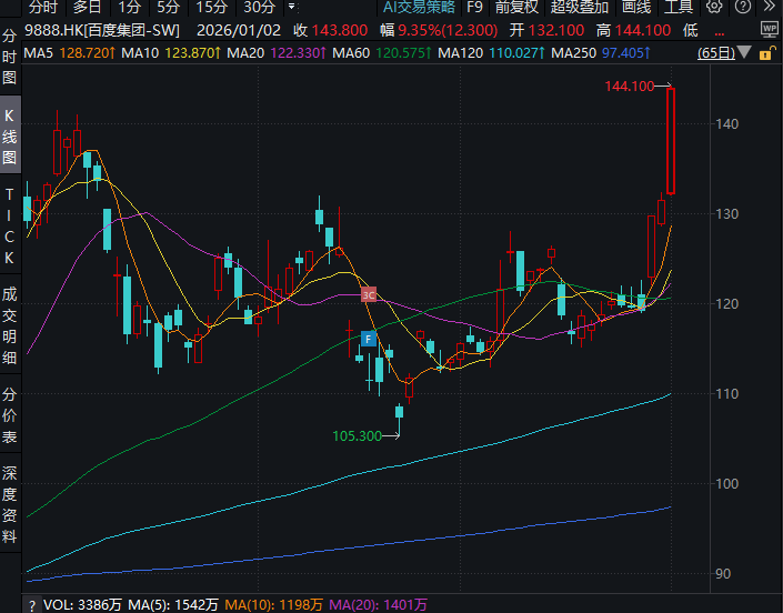 或受此消息影响,百度集团1月2日股价大涨,盘中一度达144.1港元/股,收报143.8港元/股,涨幅为9.35%,总市值升至3955亿港元。