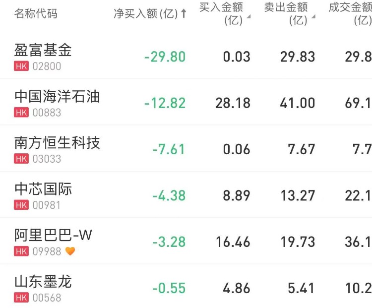 盈富基金、中国海洋石油、南方恒生科技分别遭净卖出29.80亿港元、12.82亿港元、7.61亿港元。
