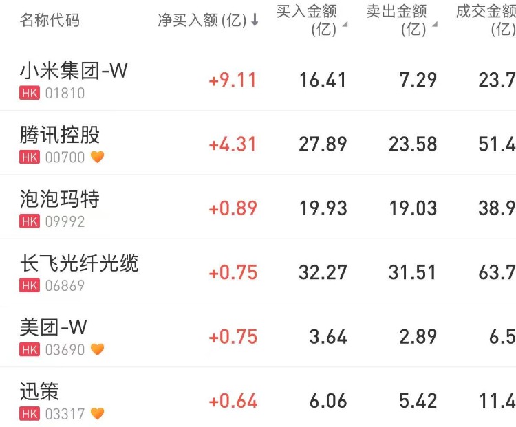 小米集团-W、腾讯控股、泡泡玛特分别获净买入9.11亿港元、4.31亿港元、0.89亿港元;