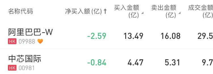阿里巴巴-W、中芯国际分别遭净卖出2.59亿港元、0.84亿港元。