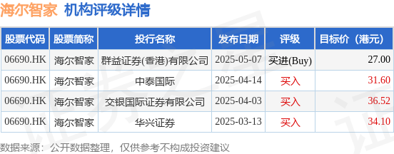 截至2025年5月21日收盘,海尔智家(06690.HK)报收于23.95港元,上涨0.42%,换手率0.51%,成交量1462.72万股,成交额3.5亿港元。投行对该股的评级以买入为主,近90天内共有3家投行给出买入评级,近90天的目标均价为32.3港元。群益证券(香港)有限公司最新一份研报给予海尔智家买进(Buy)评级,目标价27港元。