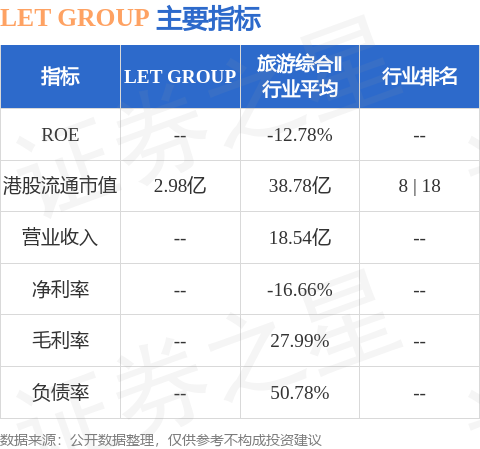 LET GROUP港股市值2.98亿港元,在旅游综合Ⅱ行业中排名第8。主要指标见下表: