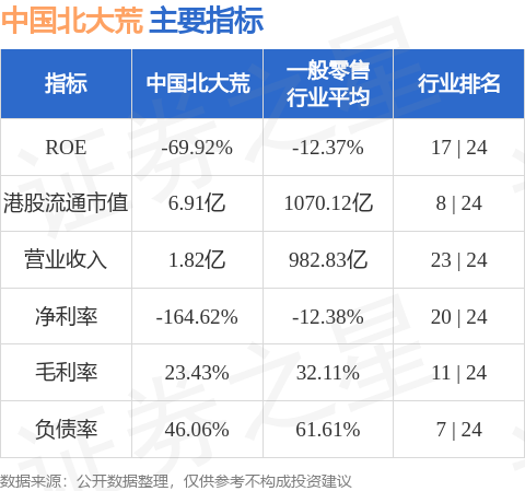 中国北大荒港股市值6.91亿港元,在一般零售行业中排名第8。主要指标见下表: