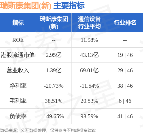 瑞斯康集团(新)港股市值2.95亿港元,在通信设备行业中排名第19。主要指标见下表: