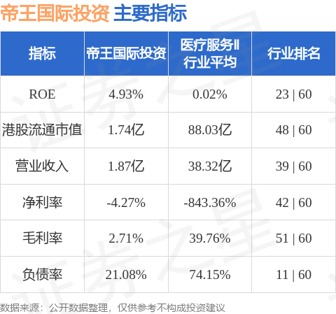 帝王国际投资港股市值1.74亿港元,在医疗服务Ⅱ行业中排名第48。主要指标见下表: