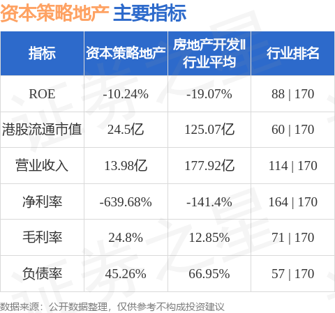 资本策略地产港股市值24.5亿港元,在房地产开发Ⅱ行业中排名第60。主要指标见下表: