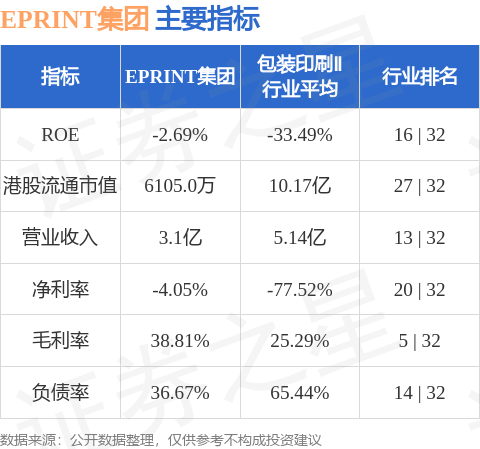 EPRINT集团港股市值6105万港元,在包装印刷Ⅱ行业中排名第27。主要指标见下表: