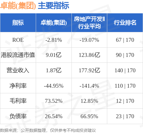 卓能(集团)港股市值9.01亿港元,在房地产开发Ⅱ行业中排名第90。主要指标见下表: