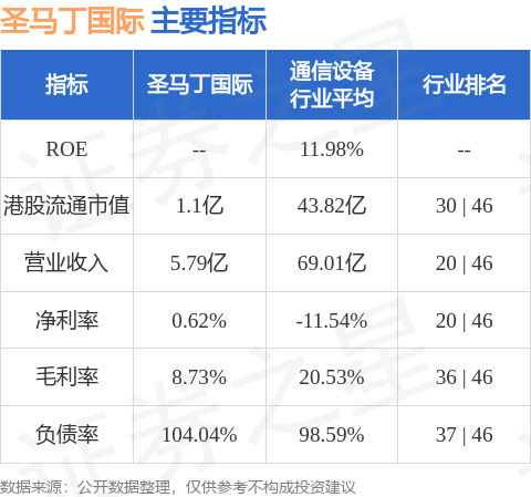 圣马丁国际港股市值1.1亿港元,在通信设备行业中排名第30。主要指标见下表: