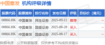 截至2025年9月30日收盘,中国秦发(00866.HK)报收于3.31港元,上涨6.77%,成交量599.6万股,成交额1951.37万港元。投行对该股的评级以买入为主,近90天内共有2家投行给出买入评级。民生证券最新一份研报给予中国秦发推荐评级。