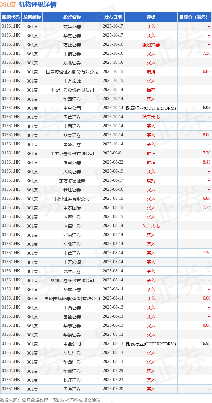 投行对该股的评级以买入为主,近90天内共有31家投行给出买入评级,近90天的目标均价为7.35港元。东吴证券最新一份研报给予361度买入评级。