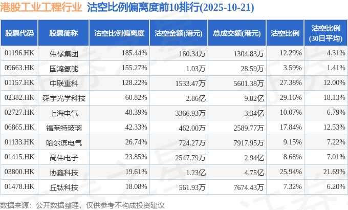 从沽空比例偏离度来看,伟禄集团、国鸿氢能、中联重科沽空比例偏离度位居行业前三,分别为185.44%、155.27%、128.22%。