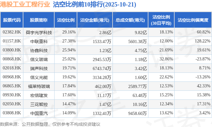 从沽空比例来看,舜宇光学科技、中联重科、协鑫科技沽空比例位居行业前三,分别为29.16%、27.38%、25.94%。