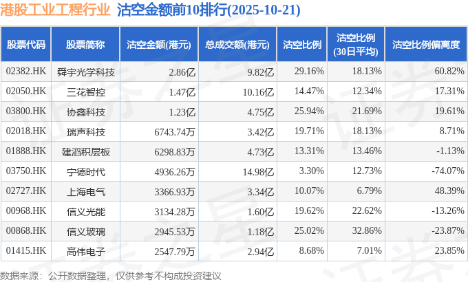 从沽空金额来看,舜宇光学科技、三花智控、协鑫科技沽空金额位居行业前三,分别为2.86亿港元、1.47亿港元、1.23亿港元。