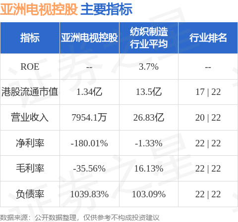 亚洲电视控股港股市值1.34亿港元,在纺织制造行业中排名第17。主要指标见下表: