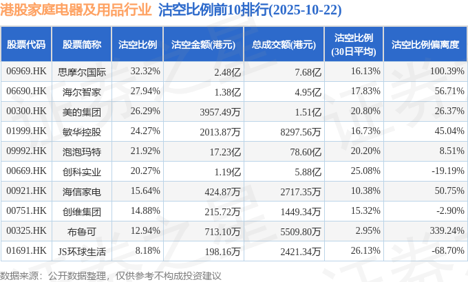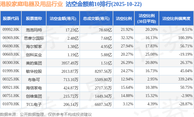 由于港股人民币柜台交易股票成交金额较小,沽空比例普遍偏高,为了避免干扰,已将人民币柜台交易股票从排行表格中剔除。