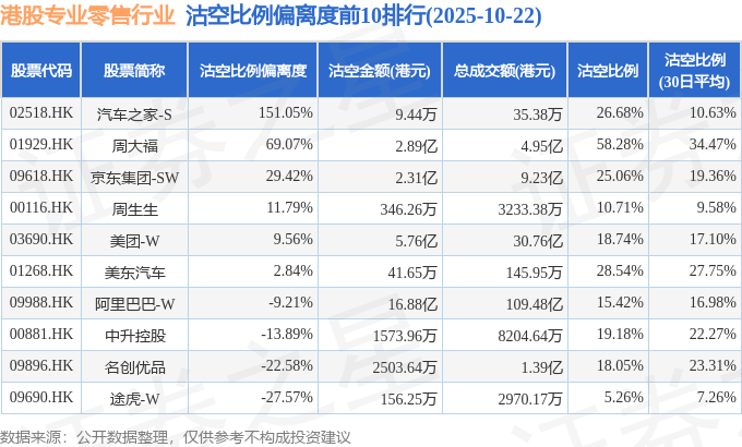 从沽空比例偏离度来看,汽车之家-S、周大福、京东集团-SW沽空比例偏离度位居行业前三,分别为151.05%、69.07%、29.42%。
