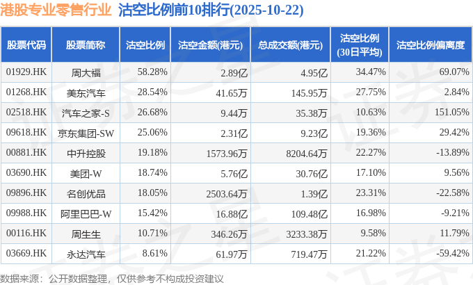 从沽空比例来看,周大福、美东汽车、汽车之家-S沽空比例位居行业前三,分别为58.28%、28.54%、26.68%。