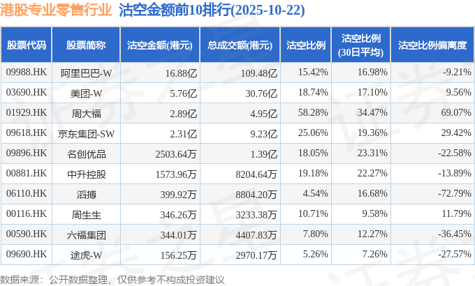 从沽空金额来看,阿里巴巴-W、美团-W、周大福沽空金额位居行业前三,分别为16.88亿港元、5.76亿港元、2.89亿港元。