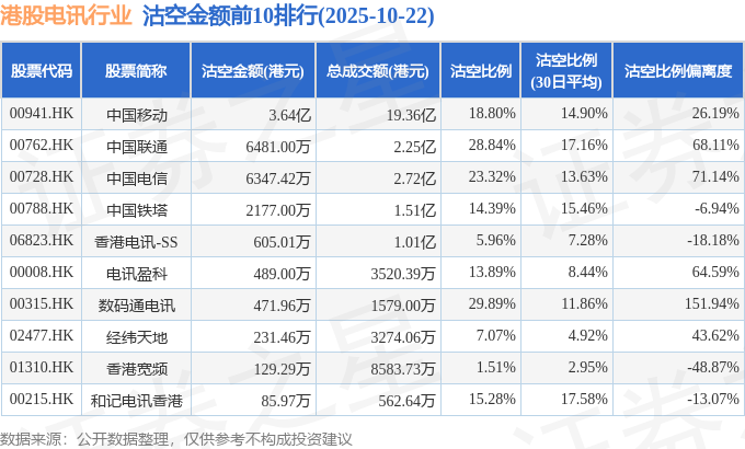 从沽空比例来看,数码通电讯、中国联通、中国电信沽空比例位居行业前三,分别为29.89%、28.84%、23.32%。