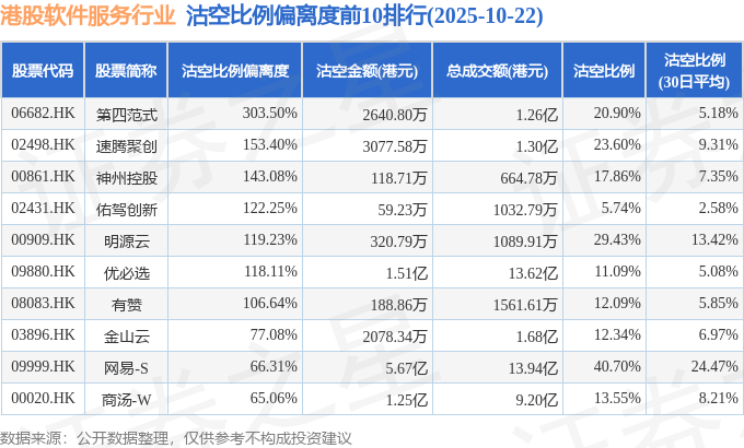 从沽空比例偏离度来看,第四范式、速腾聚创、神州控股沽空比例偏离度位居行业前三,分别为303.5%、153.4%、143.08%。