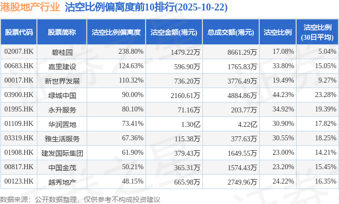 从沽空比例偏离度来看,碧桂园、嘉里建设、新世界发展沽空比例偏离度位居行业前三,分别为238.8%、124.63%、110.32%。