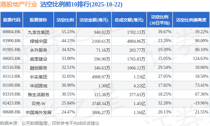 从沽空比例来看,九龙仓集团、绿城中国、永升服务沽空比例位居行业前三,分别为55.23%、44.23%、34.92%。