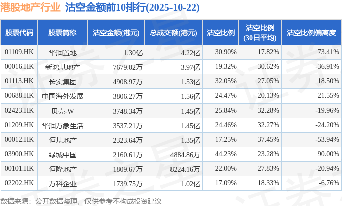 从沽空金额来看,华润置地、新鸿基地产、长实集团沽空金额位居行业前三,分别为1.3亿港元、7679.02万港元、4908.97万港元。